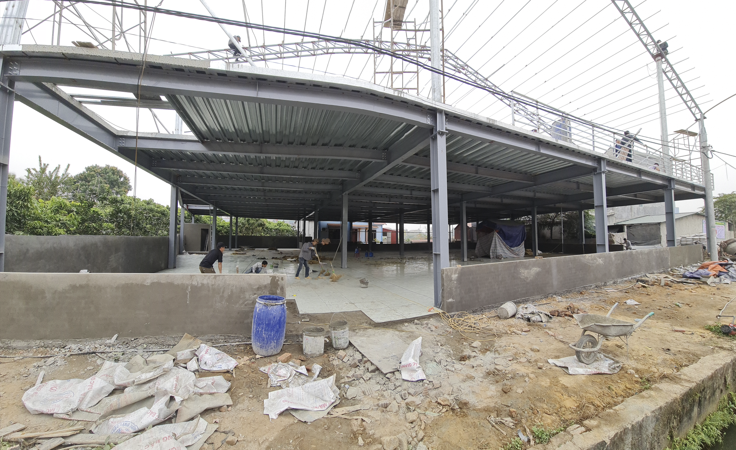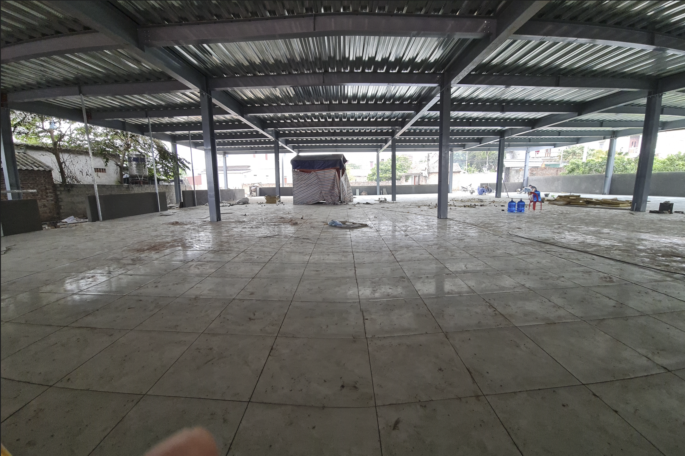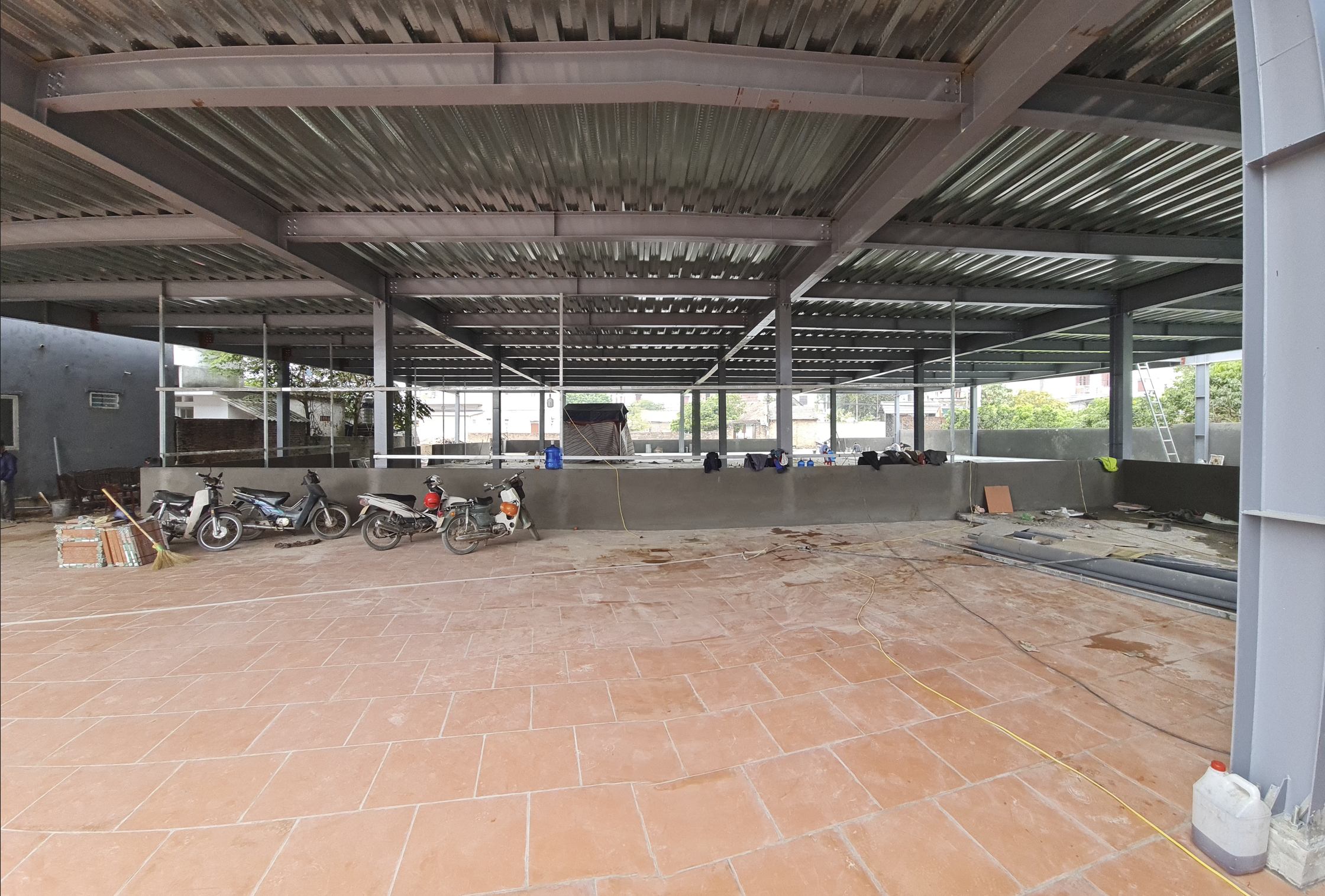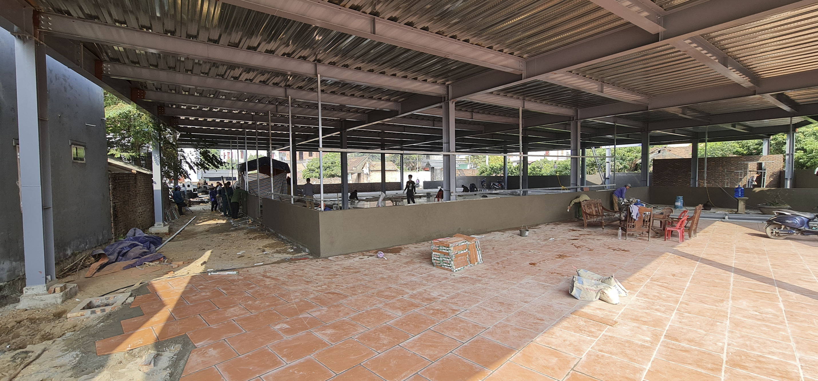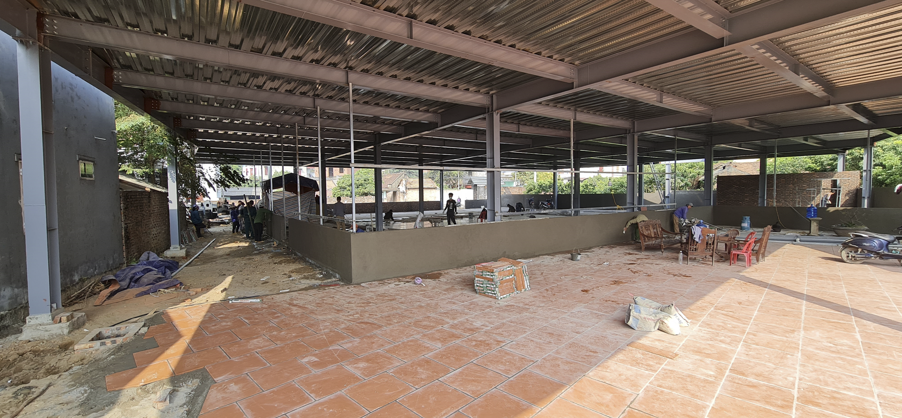 2층에서 지붕을 덮기위해 기둥을 세우고 갓을 만들어 올리는사이 1층에서도 바닥 콘크리트 타설 외벽 쌓기 바닥 틸일 시공 등 인부들이 바쁘게 움직인 덕에 2층 갓을 마무리하면서 1층도 하루 늦게 마무리가 되었다.