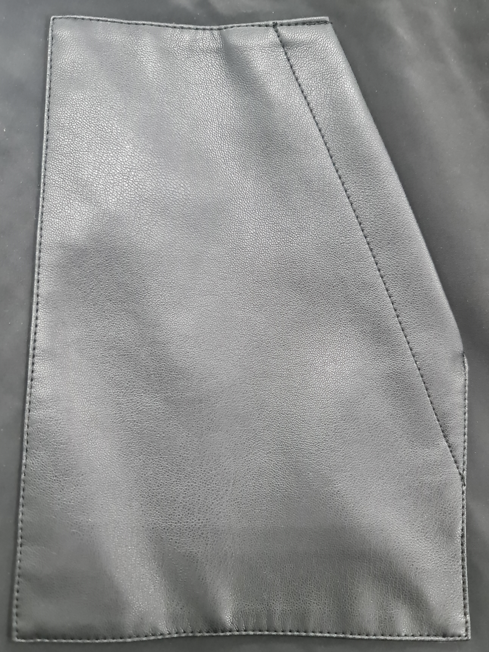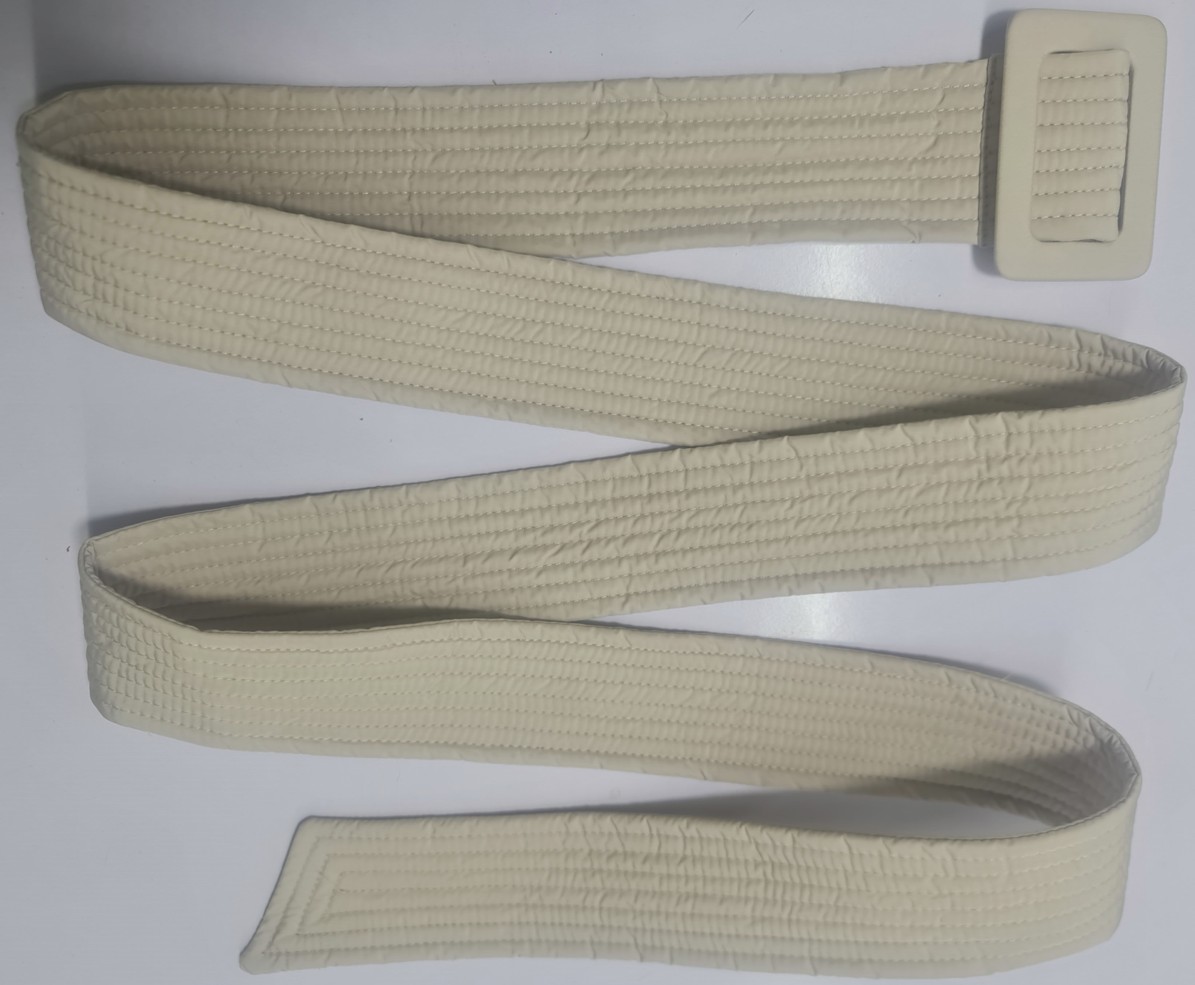 다본침으로 8cm 폭의 패딩과 원단 비접착 심지 3겹을 동시에 봉재하여 뒤집어 제천 벨트를 만든다.